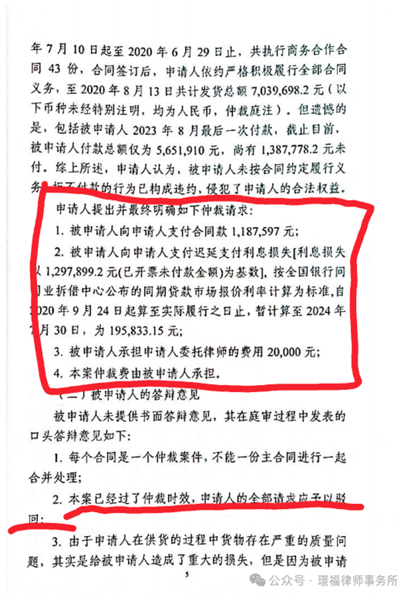 甲公司面对高达140万的仲裁请求,委托本所王明、王雷律师作为诉讼代理人出庭应诉。经过两位律师整理相关材料,梳理法律关系后,提出以下抗辩要点: 1、本案涉及十三份合同,每份合同的签署、发货、付款、验收都是独立的,不能混而一谈。每一份合同都是独立的法律关系,应当分别审查合同的履行、货物的质量、诉讼时效的问题。 2、诉讼时效均早已届满,若乙公司无法提供诉讼时效连续中断的有效证据,应当驳回乙公司的仲裁请求。
