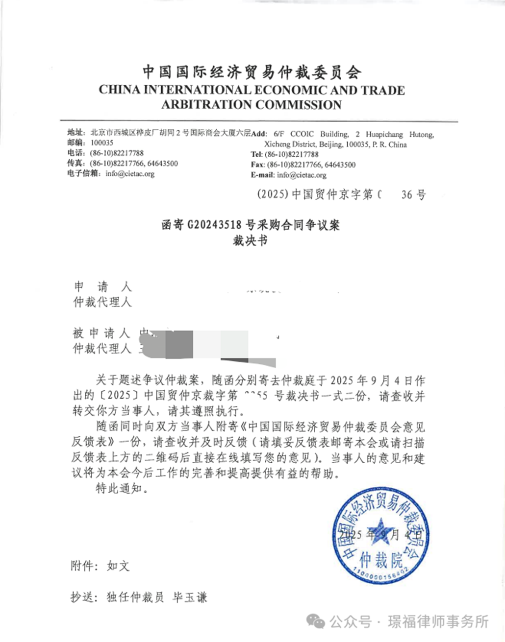 “ 本所璟福律所主任-王明律师、璟福律所公司法律事务部主任-王雷律师代理了一起合同纠纷商事仲裁案件,超预期维护了委托人的权益,获得委托人的好评。”