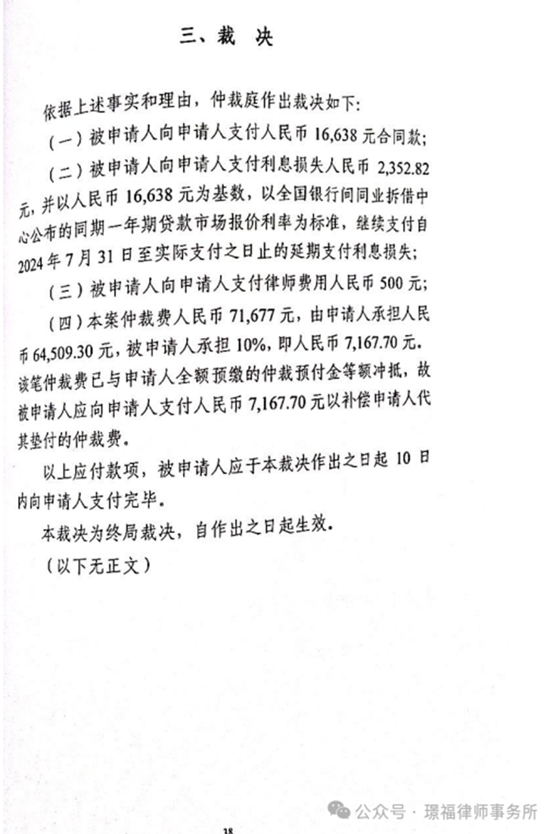 璟福胜诉案例:申请人仲裁请求高达140万,璟福律师代理被申请人,最后裁决仅支付16638元
